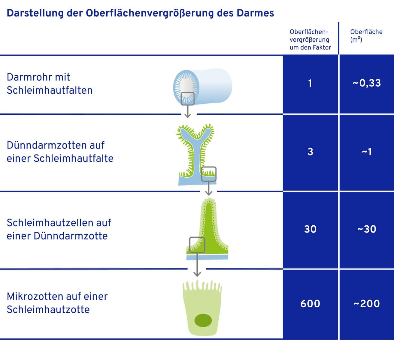 Die Graphik verdeutlicht, wie diese enorme Oberflächenvergrößerung durch Faltungen, fingerartige Erhebungen und die auf den Schleimhautzellen befindlichen Ausstülpungen zustande kommt.