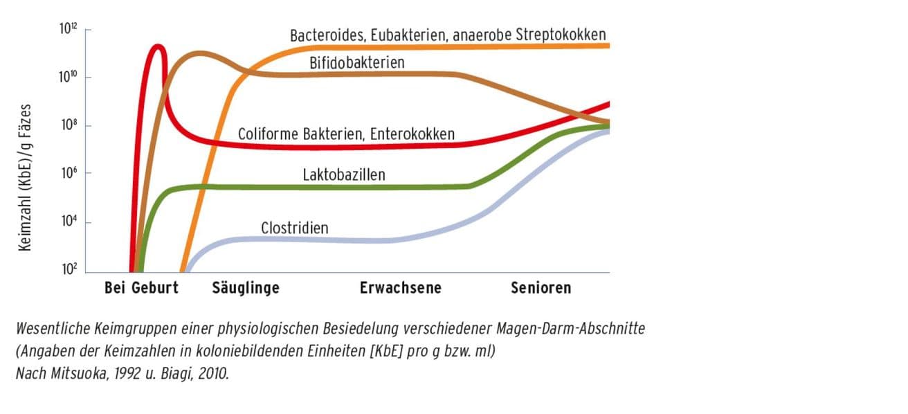 Auf die Keimfreiheit bei Geburt folgt die Erstbesiedlungsphase mit einer sich ca. ab dem 3.–5. Lebensjahr zunehmend manifestierenden Mikrobiota. Trotz inter- und intraindividueller Variabilität bleibt das bis zum frühen Jugendalter installierte Besiedelungsmuster über mehrere Lebensjahrzehnte konstant, solange keine störenden Faktoren die Mikroflora beeinträchtigen. Etwa jenseits des 50. Lebensjahres vollzieht sich nochmals eine qualitative und quantitative Umstrukturierung der Mikrobiota.